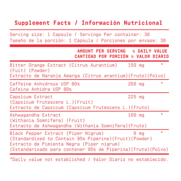 Ingredientes: Extracto de Naranja Amarga, Cafeína Anhidra, Extracto de Capsicum, Extracto de Ashwagandha, Extracto de Pimienta Negra