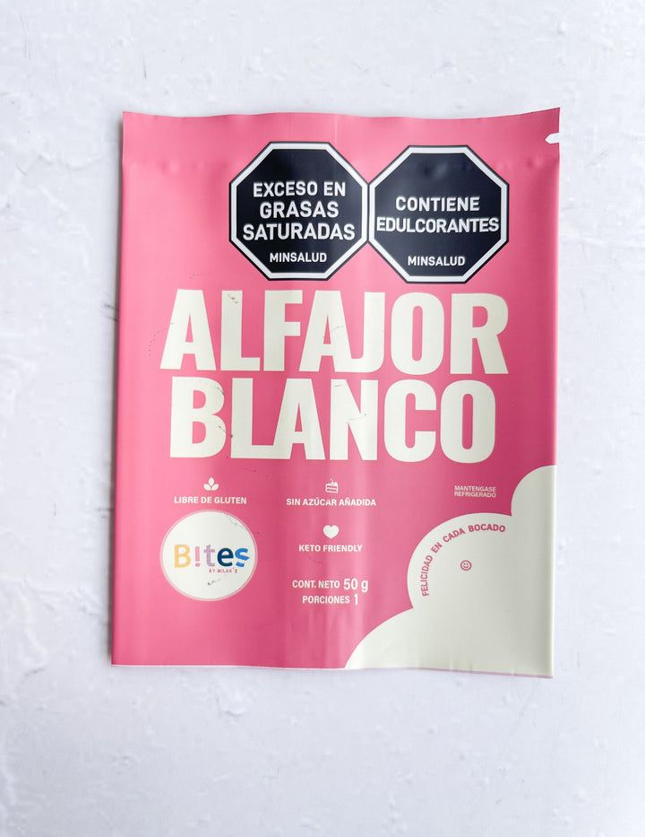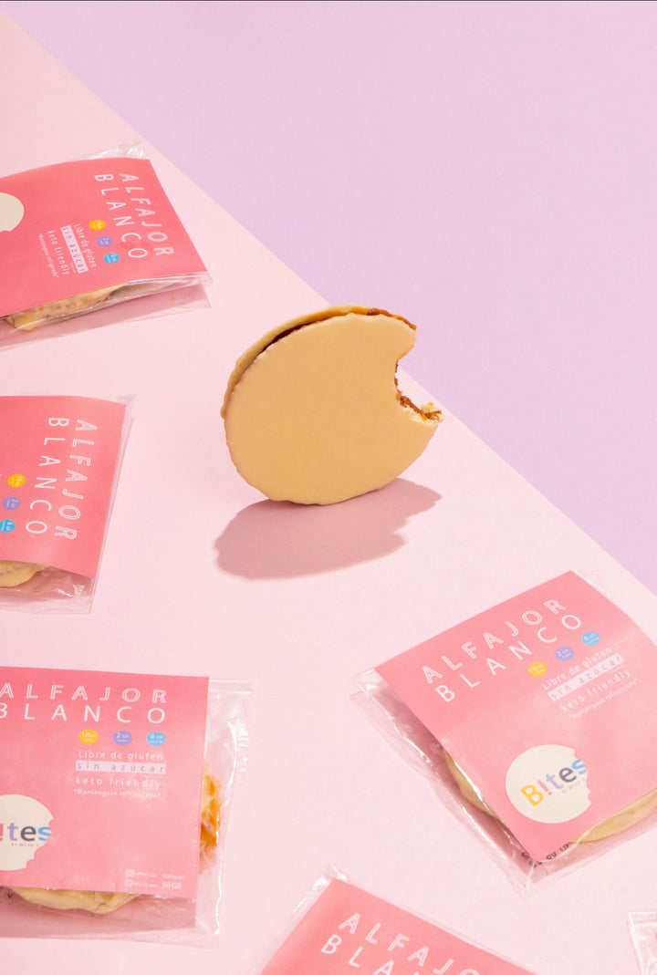Alfajor con chocolate de Bites es bajo en carbohidratos, a base de almendras (endulzado con stevia), relleno de arequipe de almendras y cubierto de chocolate blanco light (manteca de cacao, leche deslactosada, stevia). Una deliciosa opción para endulzar tu día.