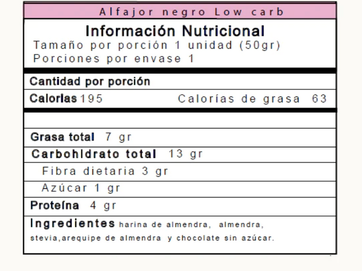Ingredientes: harina de almendras, almendra, stevia, leche de almendras, arequipe de almendra sin azúcar y chocolate sin azúcar.