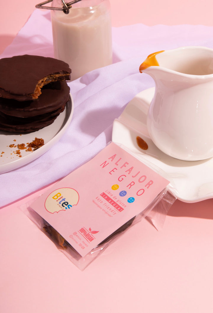 Alfajor de Bites bajo en carbohidratos, a base de almendras (endulzado con stevia), relleno de arequipe de almendras y cubierto de chocolate sin azúcar.