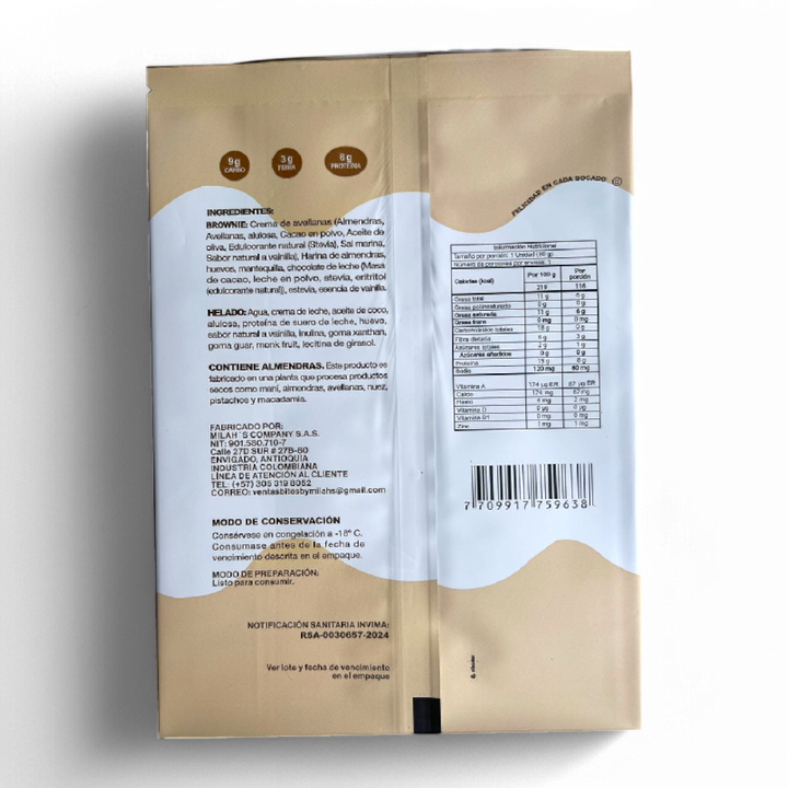 El brownie está hecho con harina de almendras, crema de avellanas y chocolate sin azúcar, mientras que el helado combina crema de leche, proteína de suero y aceite de coco, logrando una textura cremosa y un sabor irresistible.