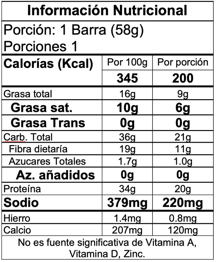Mezcla de proteína (proteína de suero aislada, proteína de leche aislada), Polidextrosa (fibra prebiótica), Aceite de Semilla de palma, agua, estevia (edulcorante), Glicerina, almendras, Caseinato de Sodio, cacao en polvo, sabor natural Galleta (saborizante), Fibra soluble de Maíz (fibra prebiótica), pasta de cacao, chocolate amargo, Sal, Lecitina (Girasol y/o soya), Leche descremada, Sucralosa (edulcorante), bicarbonato de sodio (leudante), goma xantana (gelificante), Canela, estevia (edulcorante).
