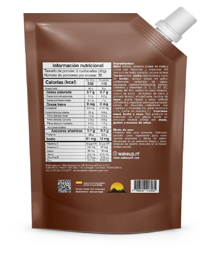 Ingredientes: Maní tostado, Alimento a base de malta y cocoa con vitaminas y minerales (extracto de malta, sólidos lácteos, azúcar,cocoa en polvo, fosfato de calcio dibasico y carbonato de calcio(fuente de Calcio), cloruro de sodio (sales minerales), hierro aminoquelado y pirofosfato de hierro (fuente de Hierro), premezcla devitaminas (C, D, B2, B6, B12, A, B3, D3, B1), lecitina de soya (emulsificante), carboximetilcelulosa sódico (agente espesante),bicarbonato de sodio (regulador de acidez), etil vainilla (sabor artificial)), ácido ascórbico (Vitamina C).