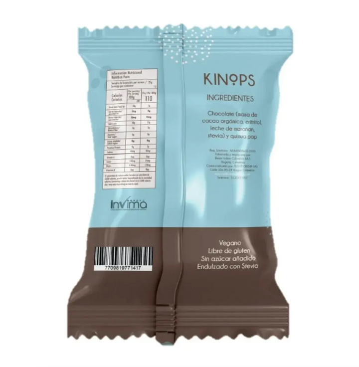 Ingredientes: Quinoa pop, chocolate (masa de cacao orgánica) eritritol, leche de marañón y Stevia