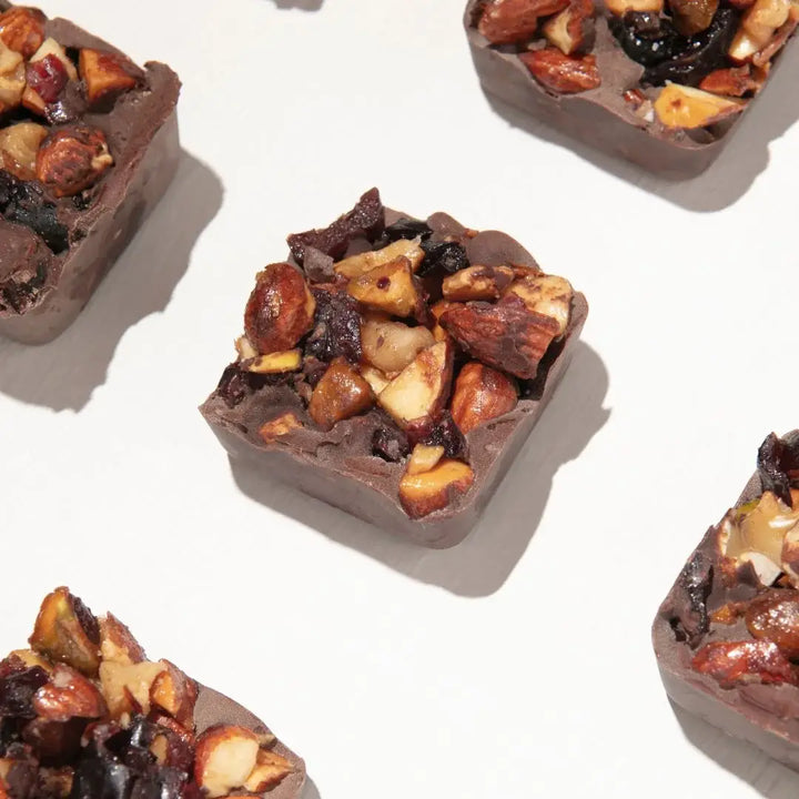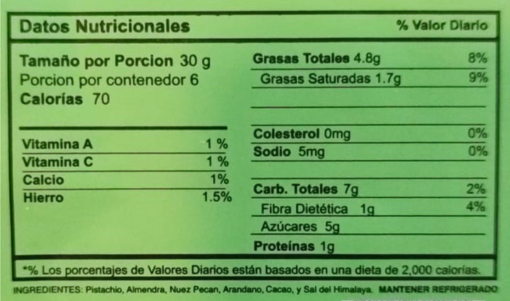 Clúster de Cacao con pistacho, almendras, nuez pecan, arándanos y sal del Himalaya.