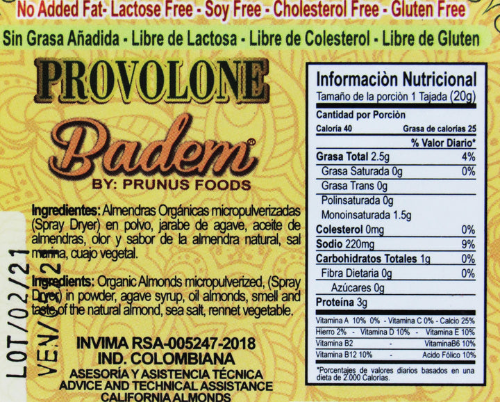 El queso en bloque tipo provolone de Badem es un alimento a base de almendras orgánicas. Es un producto vegano, vegetariano y apto para personas que no pueden consumir ningún derivado de la lactosa.