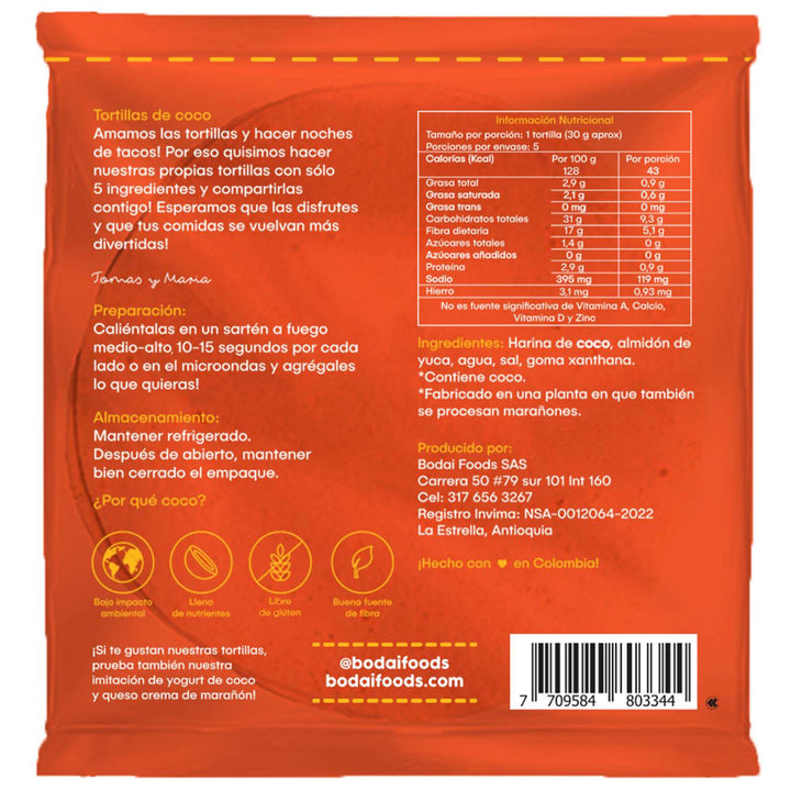 Ingredientes: Harina de coco, almidón de yuca, agua, sal, goma xanthana.